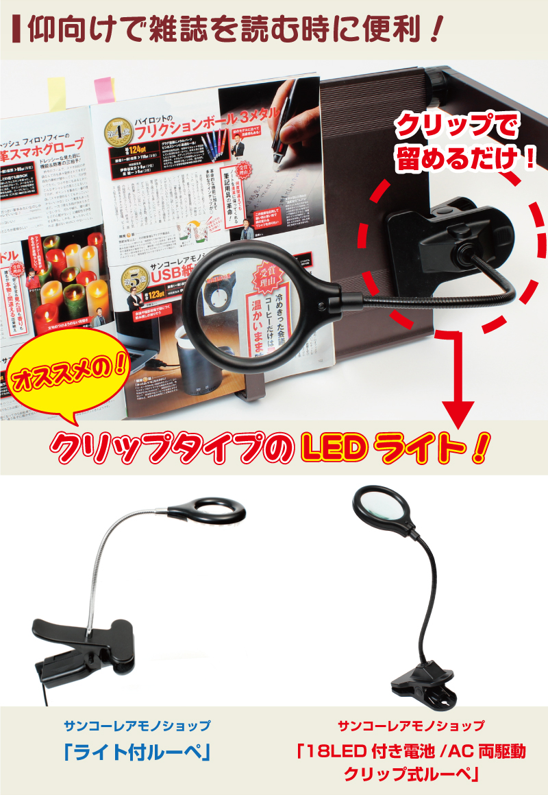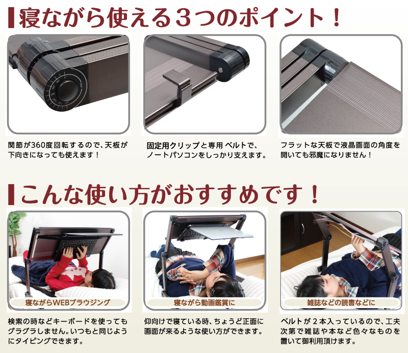 ![]() 寝ながら使える、小型で便利な折りたたみデスク「仰向けゴロ寝deスク」がさらに進化! 少し大柄な人もゆったりと使える「ワイド」タイプが登場しました! 70cmとなったワイド天板で、仰向けタイピング中の窮屈さを解消! また、天板に2機の「ファン」を搭載し、PCの冷却はもちろん、暑い季節にはファン付きテーブルとしても便利です。 通常のテーブルとして利用する時には、ご飯を食べながらPCをカチャカチャできるくらい余裕のスペース!広々と使えるようになりました。 進化し続けるサンコーベストセラーシリーズにニューカマー! 「仰向けゴロ寝deスクワイドCOOL」をぜひお試し下さい! 仰向けゴロ寝deスクがワイドになった! 「仰向けゴロ寝deスクワイドCOOL」は、「仰向けゴロ寝deスク」がワイドに!70cmのワイドな天板は、両肩をいれてもスムーズにPC操作が行えます!肩幅のある男性でもラクラクのスペース! また、天板に2機のファンを搭載!ダブルタイフーン効果で、PCの放熱効果が大幅にアップしました。 もちろん、「仰向けゴロ寝deスク」同様に、仰向けでPCを使用できるように固定バンドと専用のフックも付属します。 PCでブラウジング、雑誌を読んだり、色々な使い方ができます! 「仰向けゴロ寝deスクワイドCOOL」は、「仰向けゴロ寝deスク」の便利さをしっかりと受け継いでいます。PCを設置して、キーボードを使用したり、のんびりと映画鑑賞することができます。また、雑誌や大判の写真集などを設置することも可能。 さらに、天板がワイドになったことで、通常のテーブルとして使用する場合にも、PCの他にご飯や本などを置けるスペースができました。 ワイドになったことで、より快適な仰向けライフを行えます! 本や雑誌を読むときに便利なクリップ式のLEDライト! 仰向けで本や雑誌を見る時に便利なのが、サンコーのクリップ式LEDライト 「ライト付ルーペ」と 「18LED付き電池/AC両駆動クリップ式ルーペ」です。クリップタイプだから、さっと取り付けられ、暗くなりがちな誌面や手元を明るくしてくれます。 あわせていかがでしょうか! 仕様レビュー