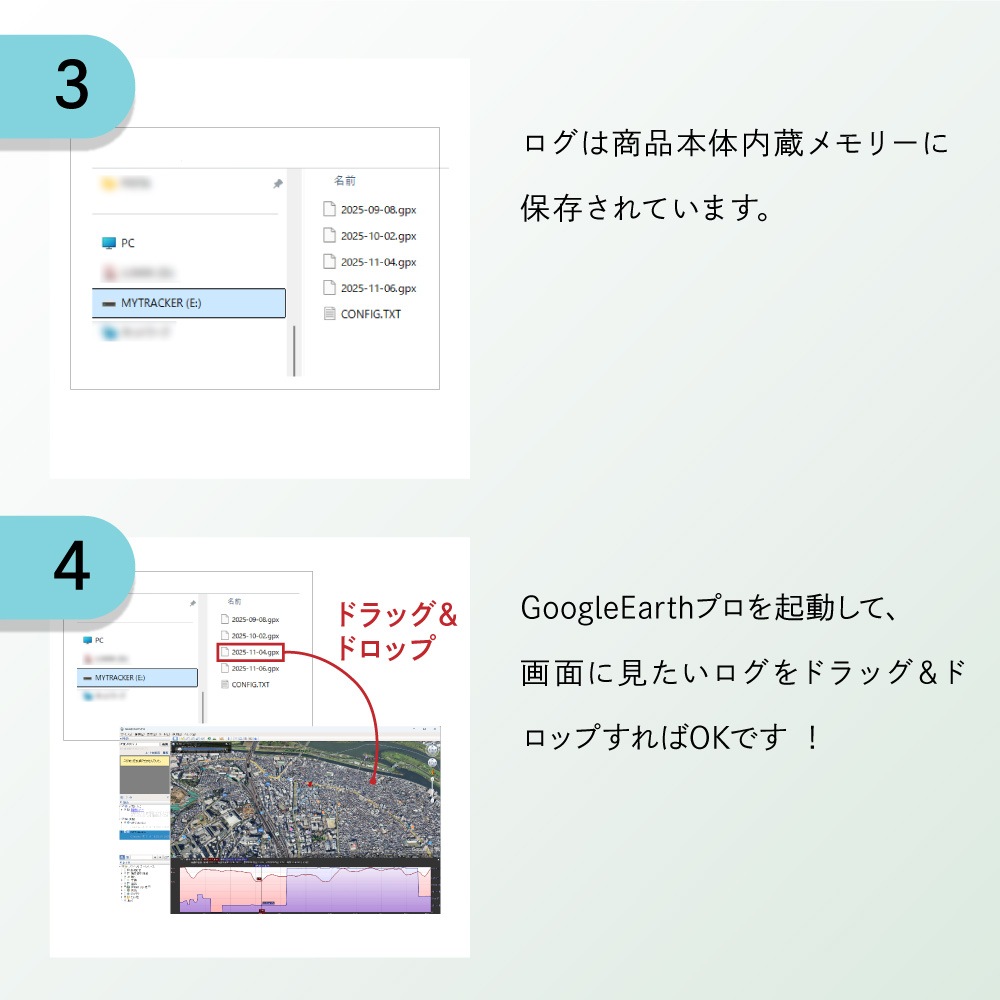 | ソフトウエア | Google Earthでログの確認が可能です。 ※Google Earthの使用方法に関しましては、サポート外となります。 |