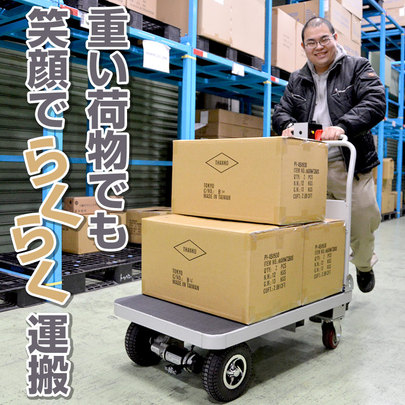 電動アシストがついた台車により、重量物運搬作業による体への負担軽減。