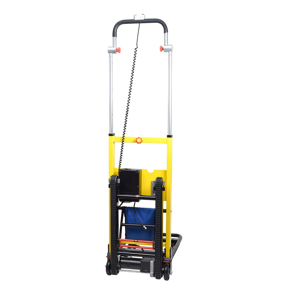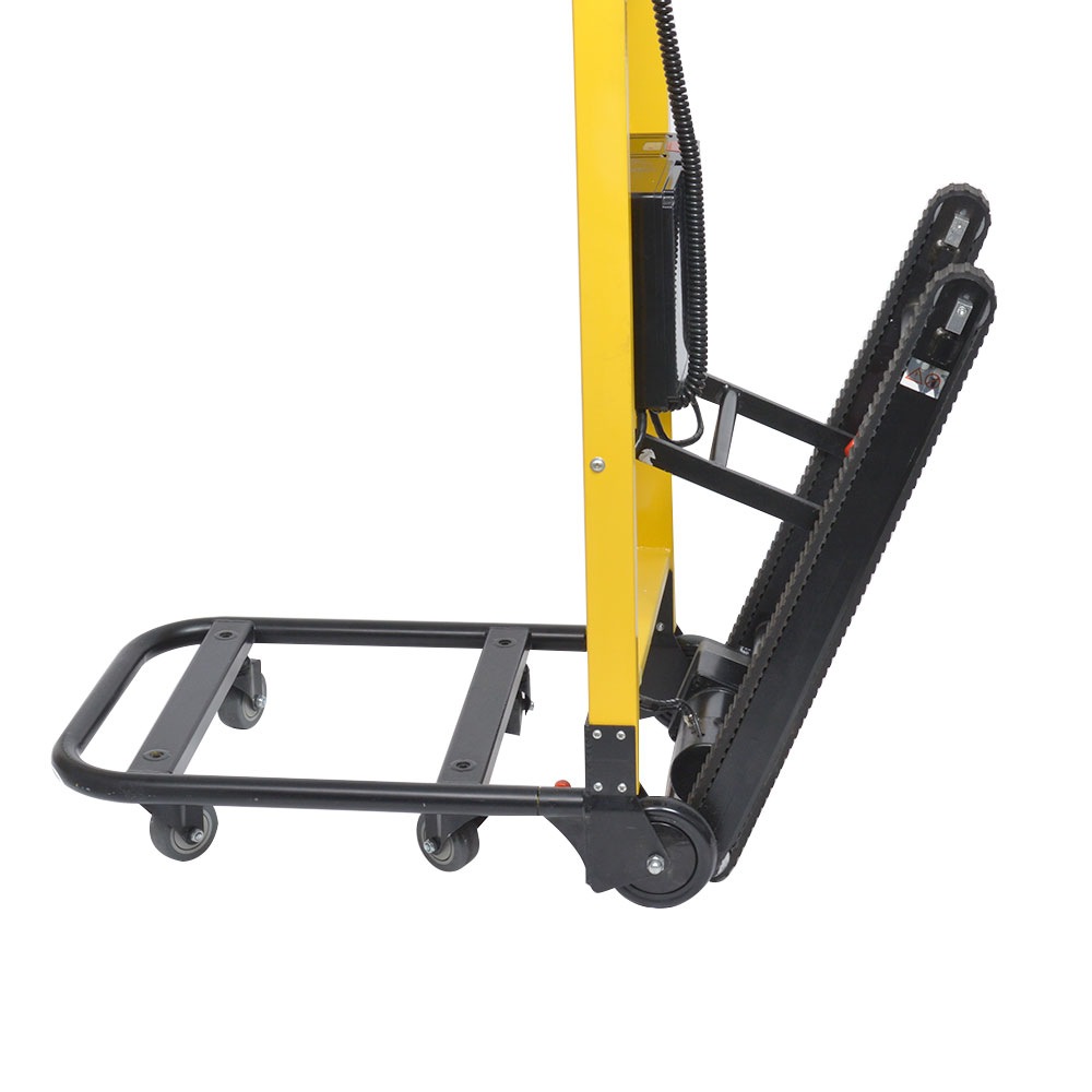 中型サイズの手押し台車の背面に、階段を昇り降りできる電動の走行ベルトと、運搬を安定させる伸縮するハンドルがついています。平地走行は手押しでスムーズに、そのまま階段を楽々昇っていける台車です。 さらにハンドル部分を曲げる事ができるようになりました。これにより階段の踊り場手前でもハンドルを持ちやすくなります。