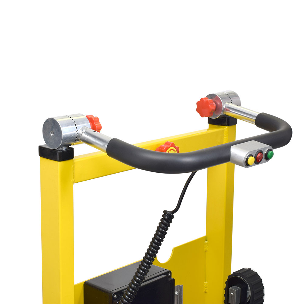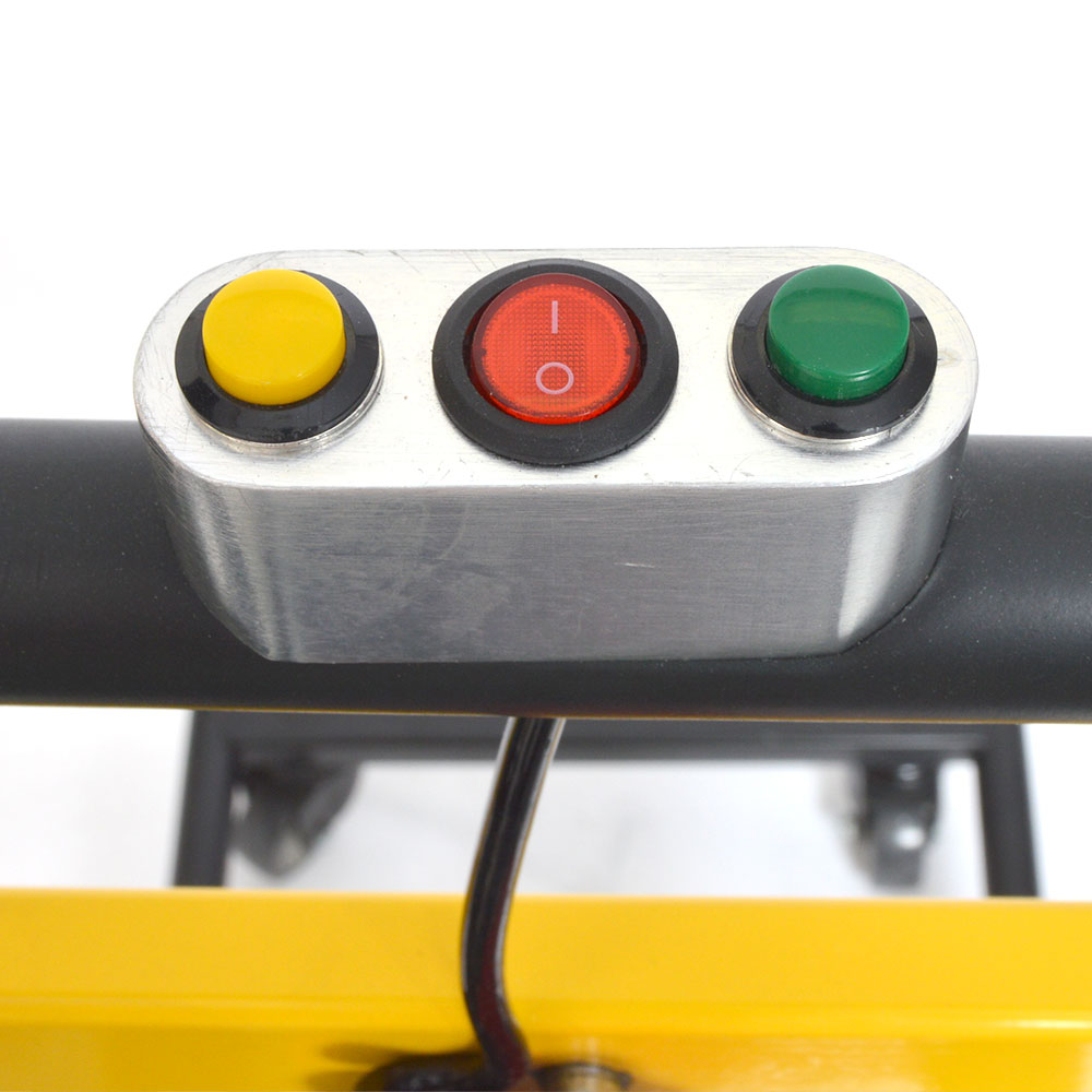 ハンドル中央に走行ベルトを操作するコントローラーがあります。コントローラーには、「昇降電源ボタン」「昇るボタン」「降りるボタン」があります。バッテリー横に鍵をさして主電源を入れてから、手元の「昇降電源ボタン」をONにすると、動かせるようになります。「昇るボタン」「降りるボタン」は押しつづけると走行ベルトが動き出します。ボタンを押し続けたときだけ動くから、離せばすぐにその場で安全に停止します。