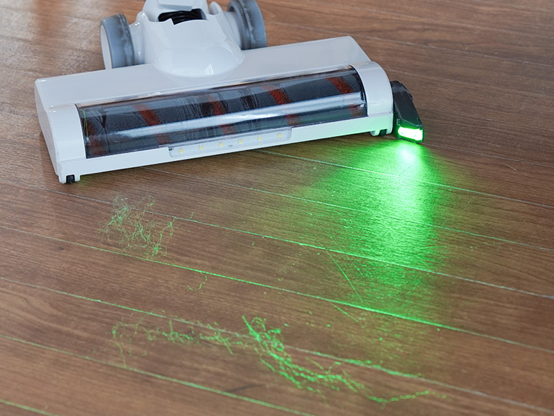 緑のライトが掃除機ヘッドの前を照らし、ホコリや小さなゴミを浮かび上がらせます。