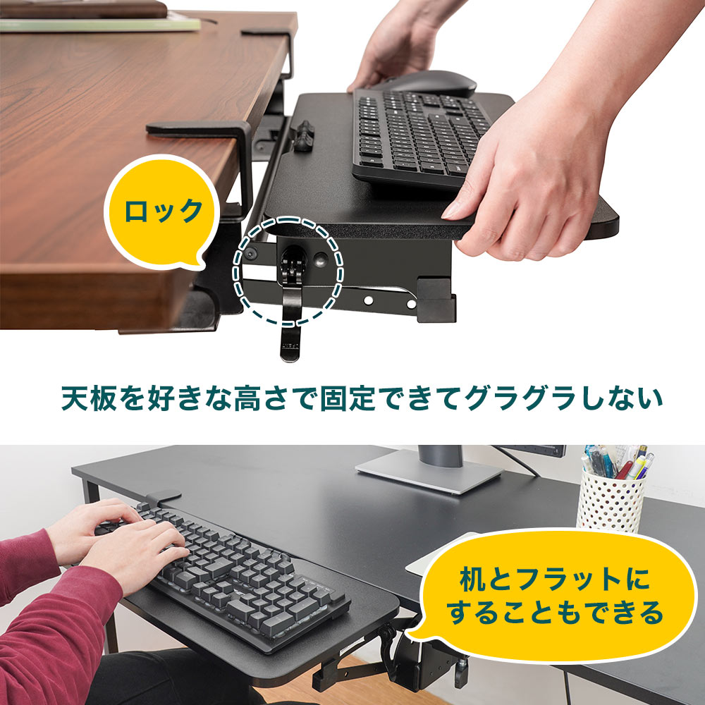 【フラットになるクランプ式キーボードスライダーL】は、クランプで机にスライド式の天板を追加することができます。