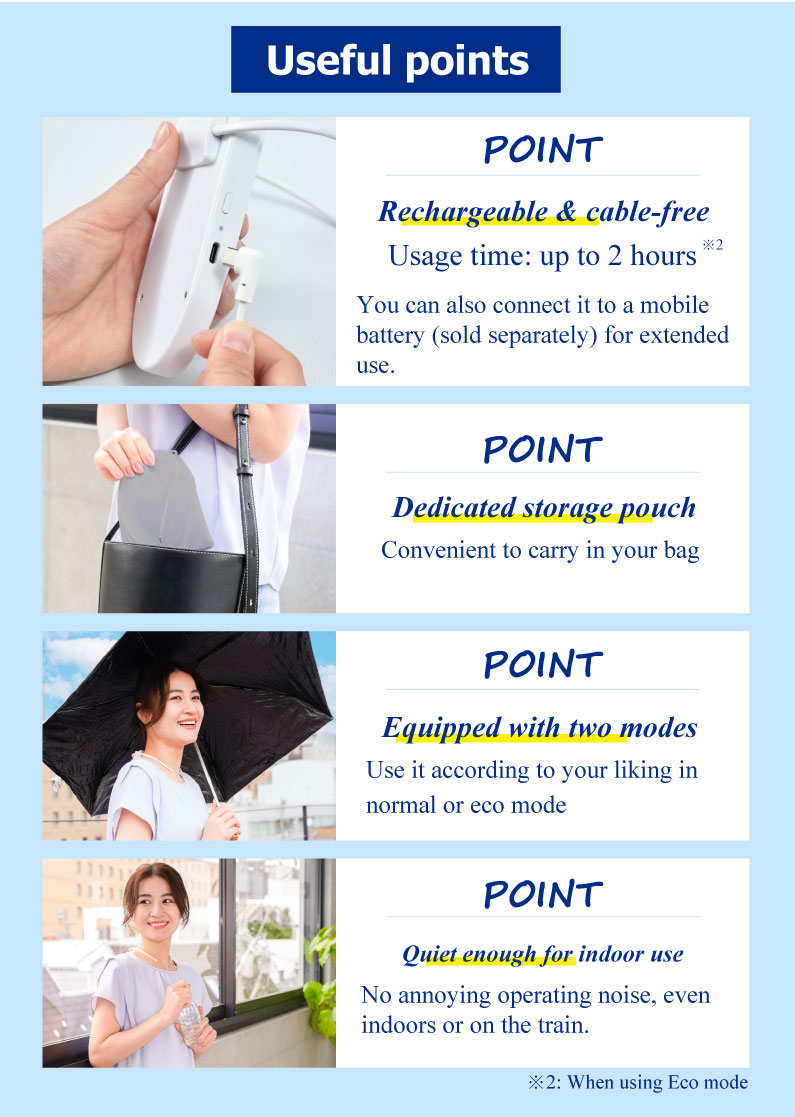 You can also use it while connected to a mobile battery (sold separately), so you can maintain the coolness for a longer period of time.