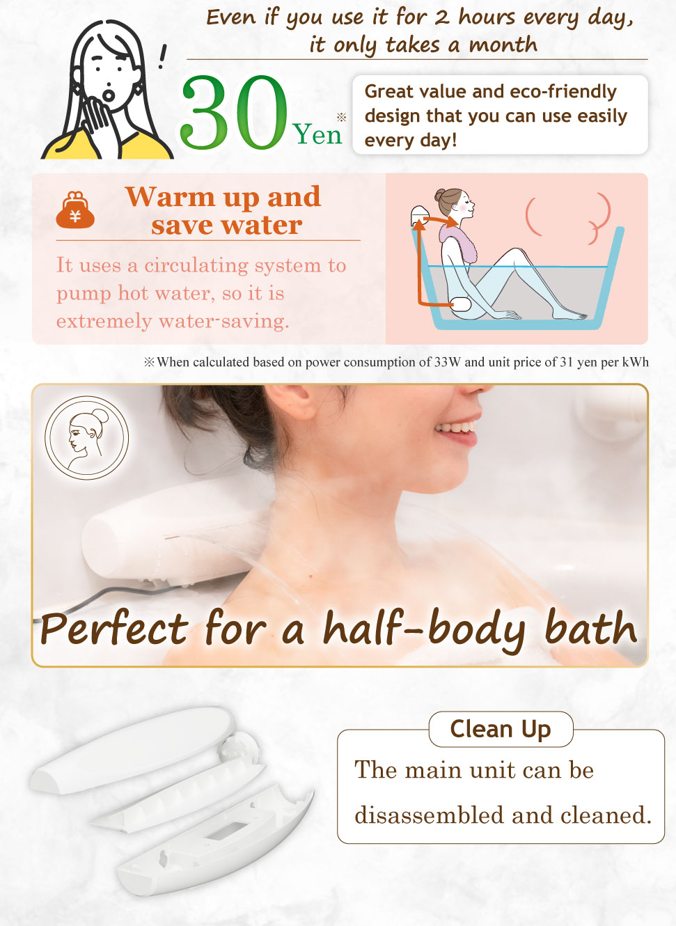 And because it is a circulating system, you can enjoy a shoulder-washing bath without having to worry about your water bill.