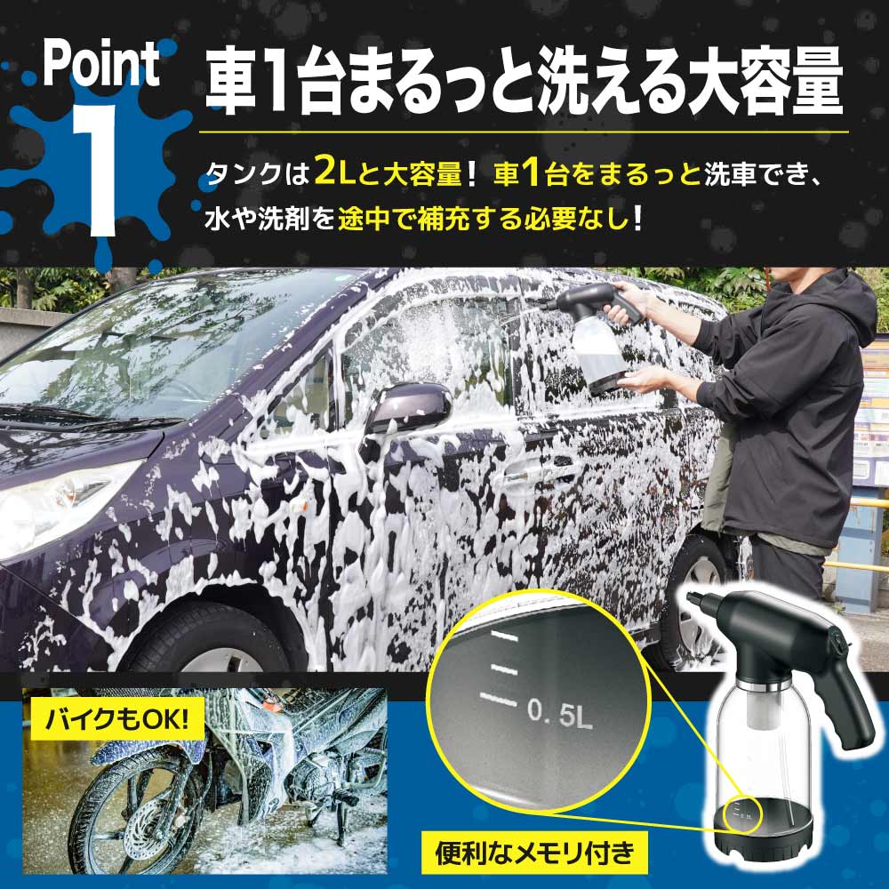水と洗剤さえあればいつでも、もこもこ泡を噴射して洗車ができます。