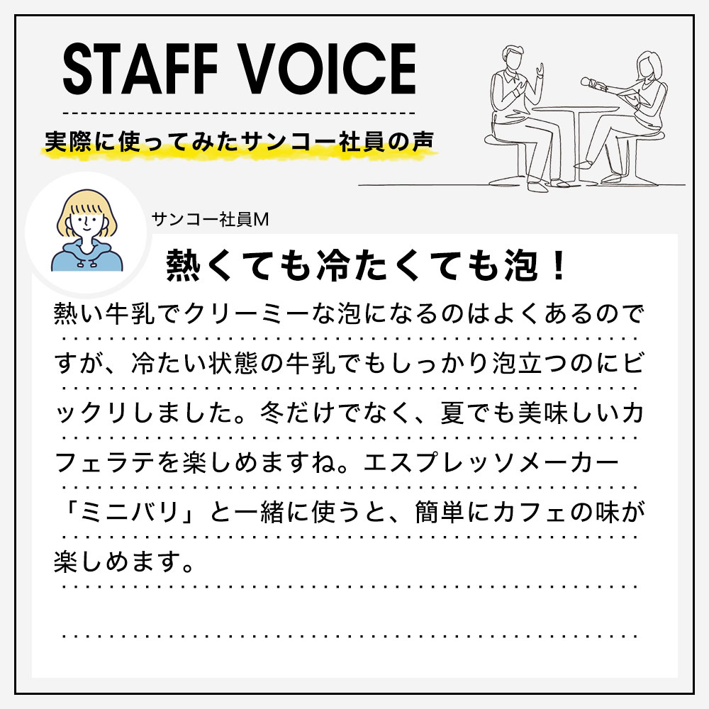 ミルクを入れてボタンを押すだけで、きめが細かいフワフワのミルクが出来上がります。
