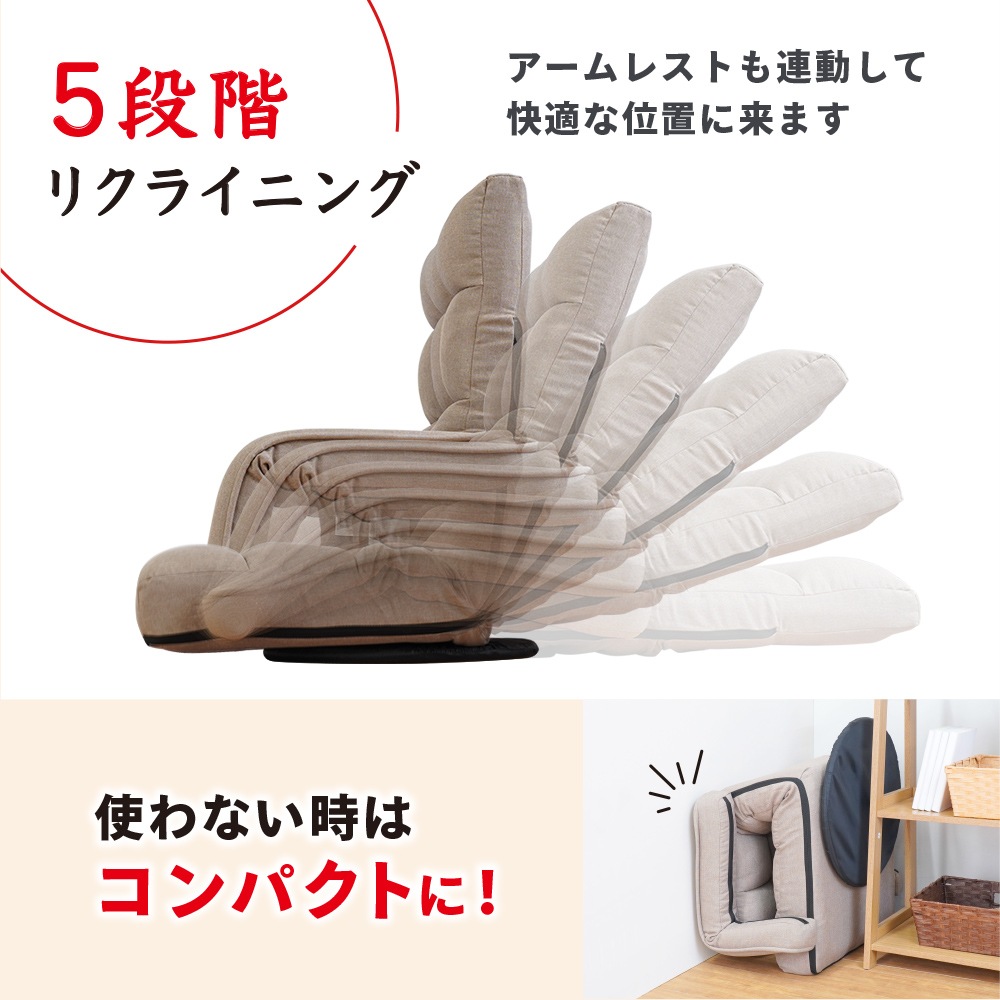 5段階のリクライニングや回転台など、座椅子としての便利機能もしっかり搭載!