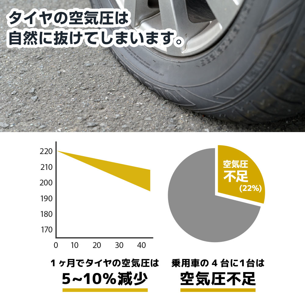 空気圧が減ると燃費低下、タイヤの減りが早くなる原因にもなってしまいます。