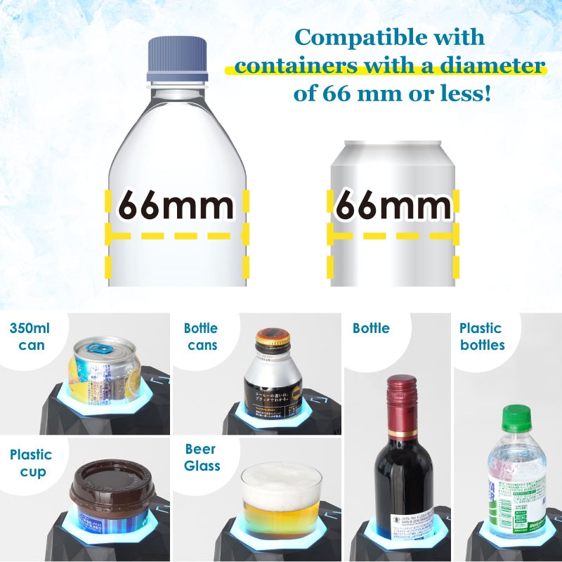 You can also cool containers other than cans and plastic bottles as long as they are 66mm or less in diameter.