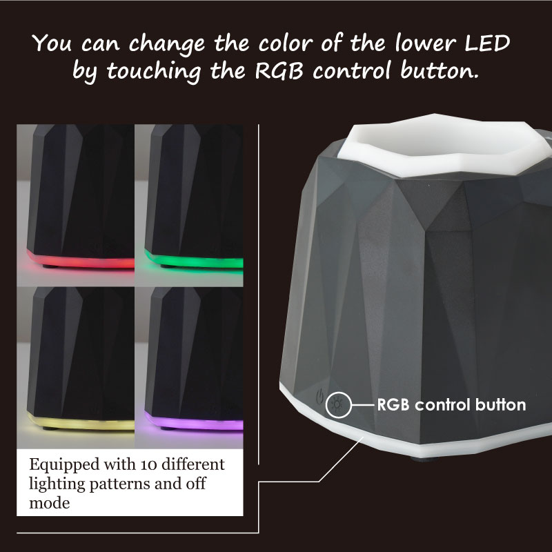 By touching the RGB control button, you can choose from 10 different lighting patterns and an off mode for the lower LED.