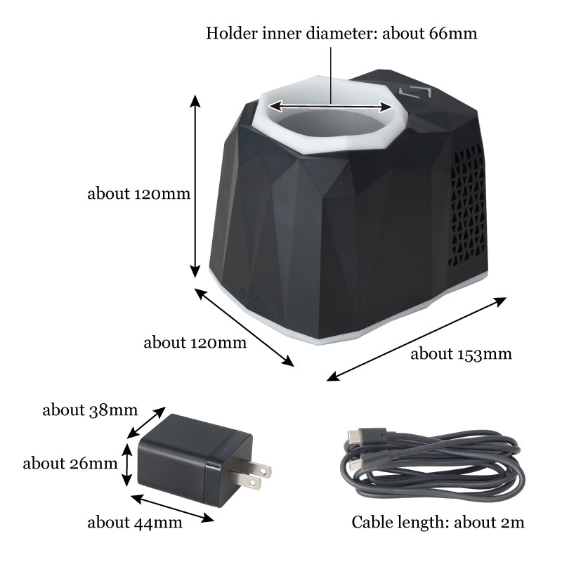 | Cooling Performance | Aluminum plate (holder) temperature: about 2°C Measured at an ambient temperature of 25°C: about 4°C at the bottom of a 350ml can ※Cooling performance varies depending on the usage environment and beverage. |