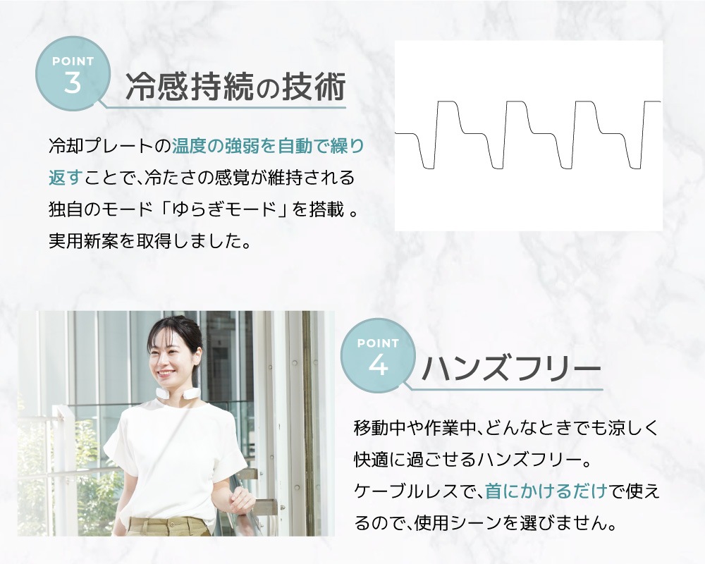 また、強〜弱を自動で繰り返す「ゆらぎモード」を搭載しているため、缶飲料を当てたような冷たさをいつまでも体感できます。