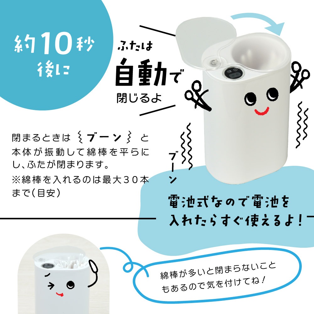 サッと手をかざせばセンサーでふたが開いて、にょろにょろ~と綿棒を押し出すよ!