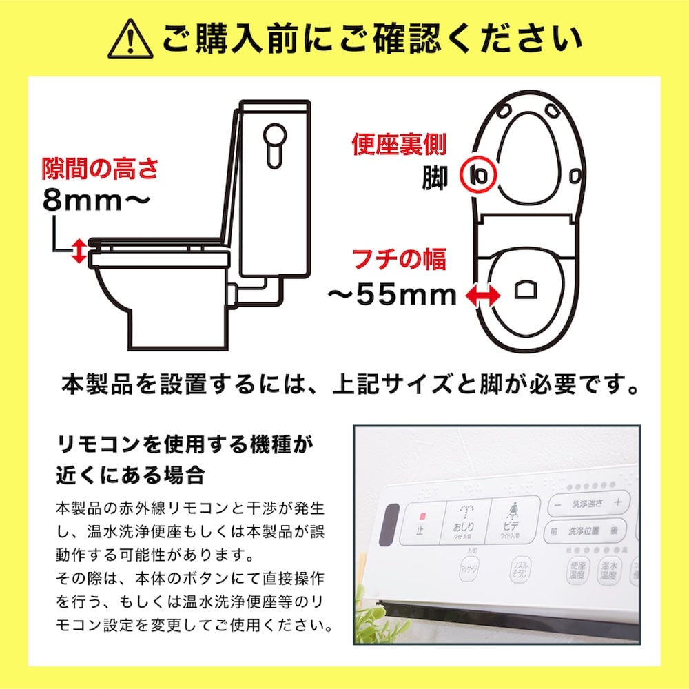 本製品を取り付けるには、便座とフチの隙間の高さが8mm程度、取り付けるフチの幅が55mm程度あり、便座の裏に脚がついているトイレが必要です。