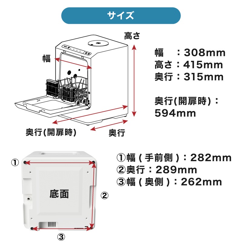 | 付属品 | トレイ、カトラリー用バスケット ×2(箸用・フォーク等用)、排水ホース (1.6m)、排水ホース用クリップ、給水カップ(1.8L) |