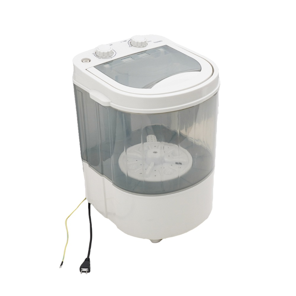 本体の側面と上部が半透明になっており、内部の構造が透けて見える小型洗濯機です。