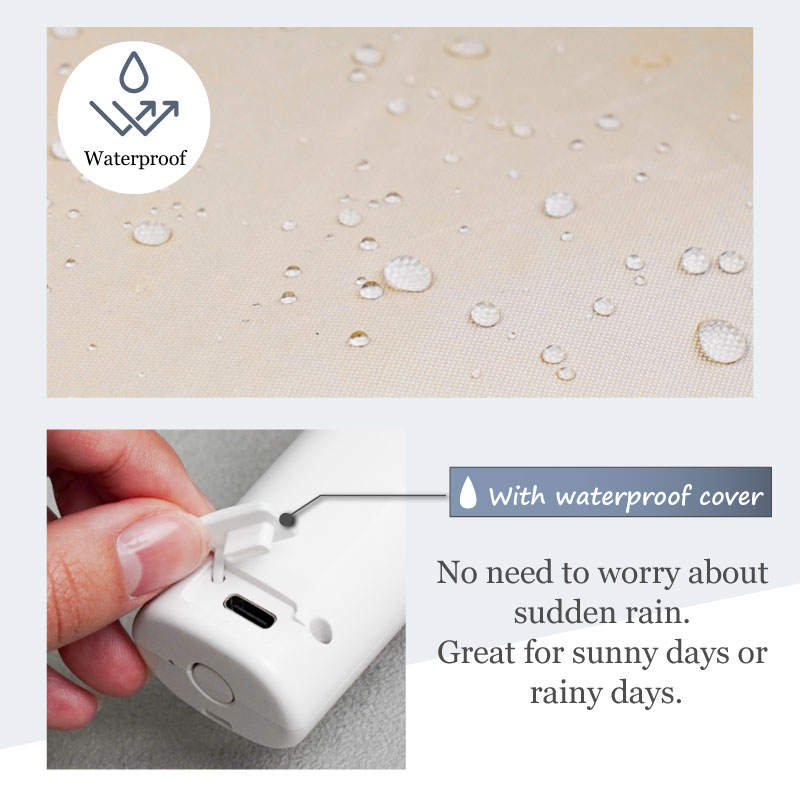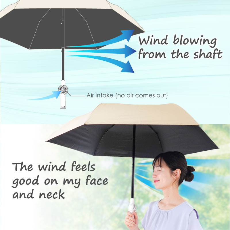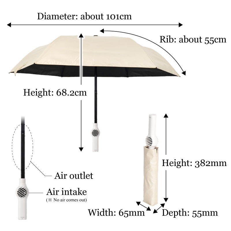 ※To prevent damage to the electrical components in the handle, do not use the product in heavy rain. ※The umbrella fabric is waterproof and water-repellent, but in heavy or prolonged rain, rainwater may seep in through the stitching. ※The waterproof and water-repellent properties of umbrella fabric will inevitably deteriorate with frequent use. We recommend reinforcing the properties with a commercially available water-repellent spray. ※If you have long hair, please be sure to tie it up. ※Never insert your fingers or any other object into the air intake. |
