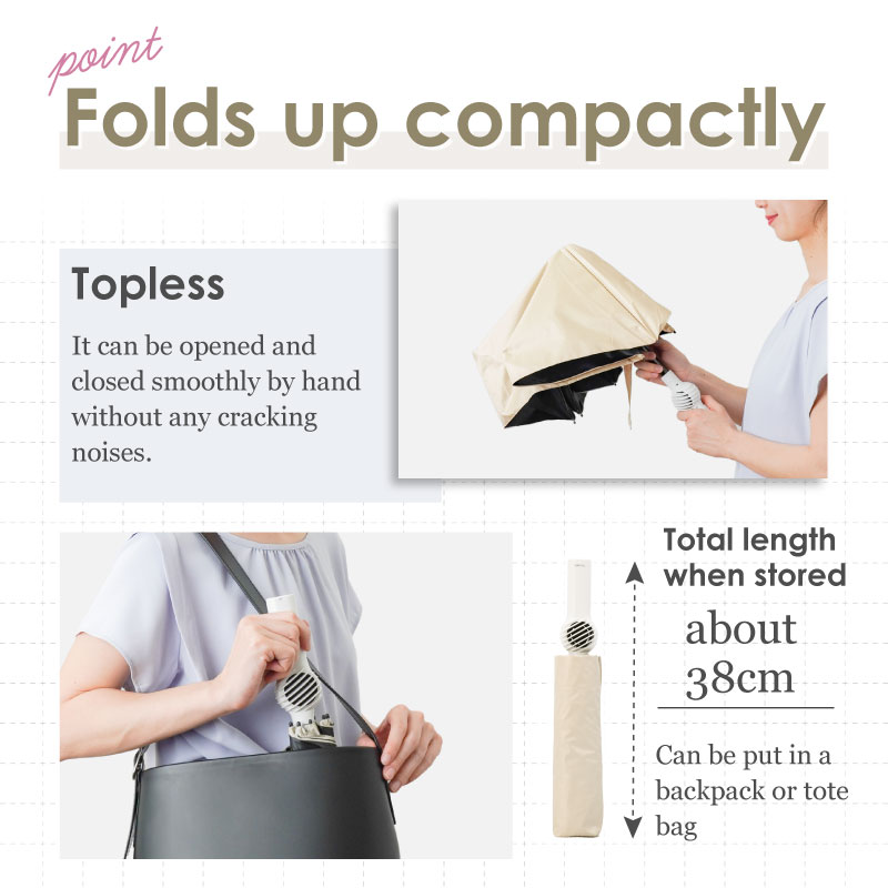 A new mechanism that lets wind come out from the umbrella shaft! This foldable parasol can withstand strong sunlight or sudden rain.