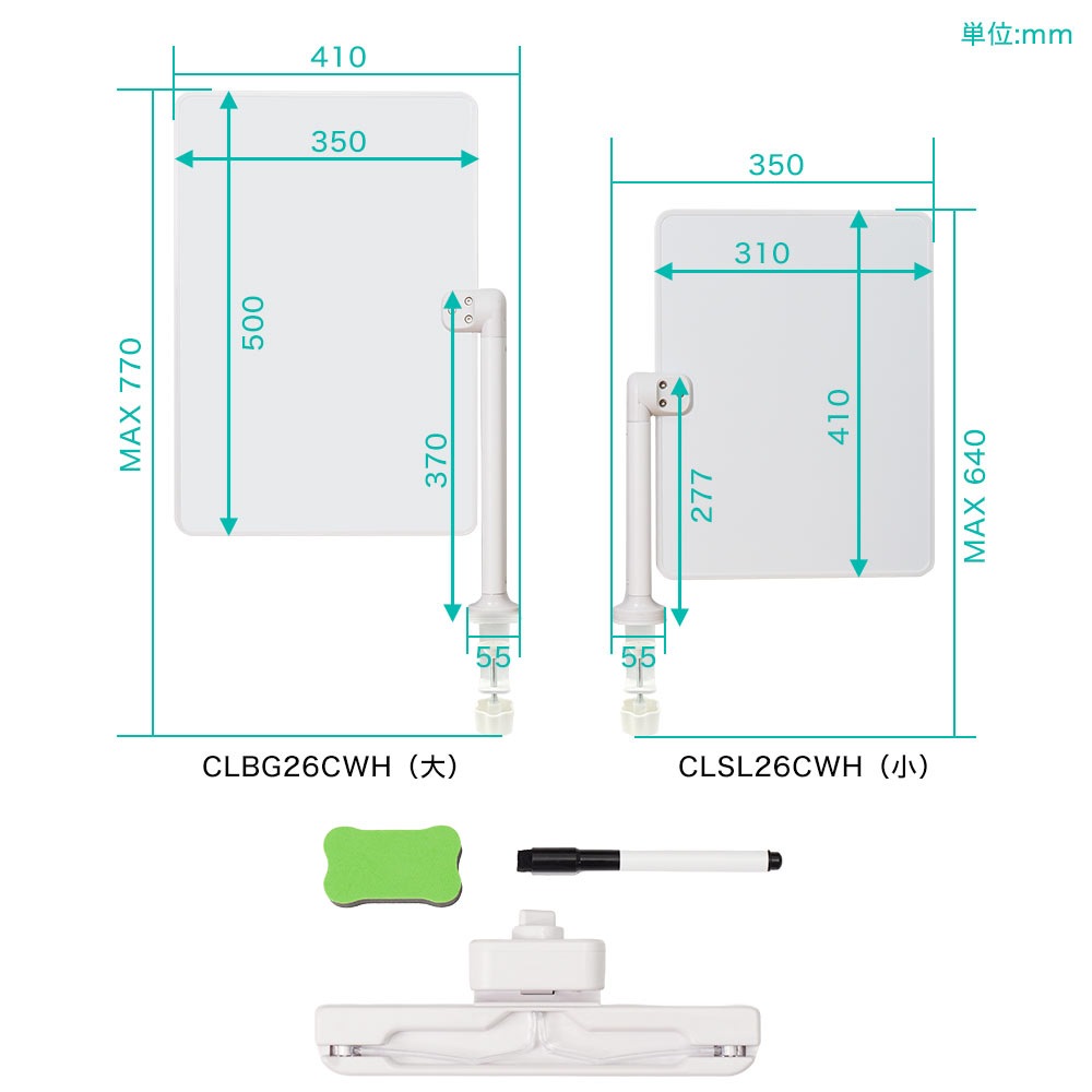 | サイズ | CLSL26CWH(小): 幅350×奥行55×高さ640mm (ホワイトボードサイズ:310×410mm) CLBG26CWH(大): 幅410×奥行55×高さ770mm (ホワイトボードサイズ:350×500mm) |