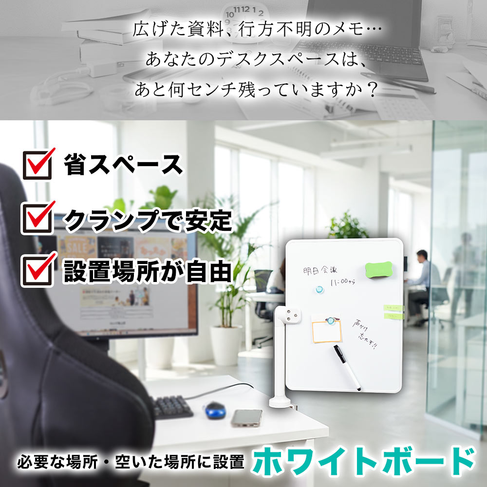 本製品はホワイトボードをクランプ固定することで、省スペース設置を可能に。
