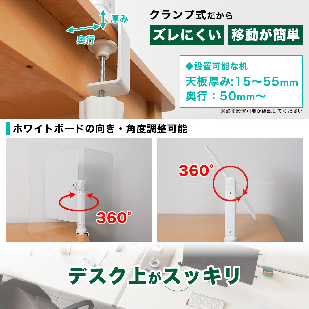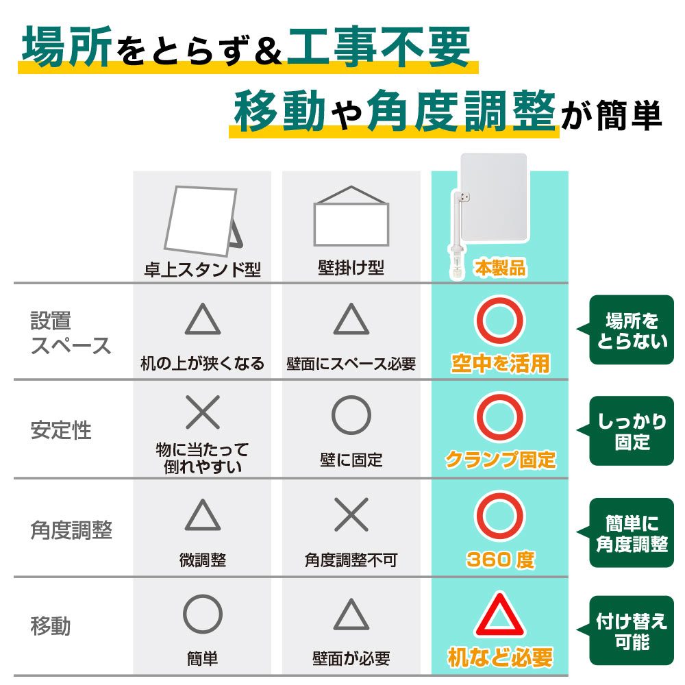 また壁掛け型は角度調整ができず、壁面などの取り付け面が必要ですが、「360度自由自在クランプ式ホワイトボード」は、角度も方向も簡単に調整でき、机などの天板があれば移動も楽に行えます。