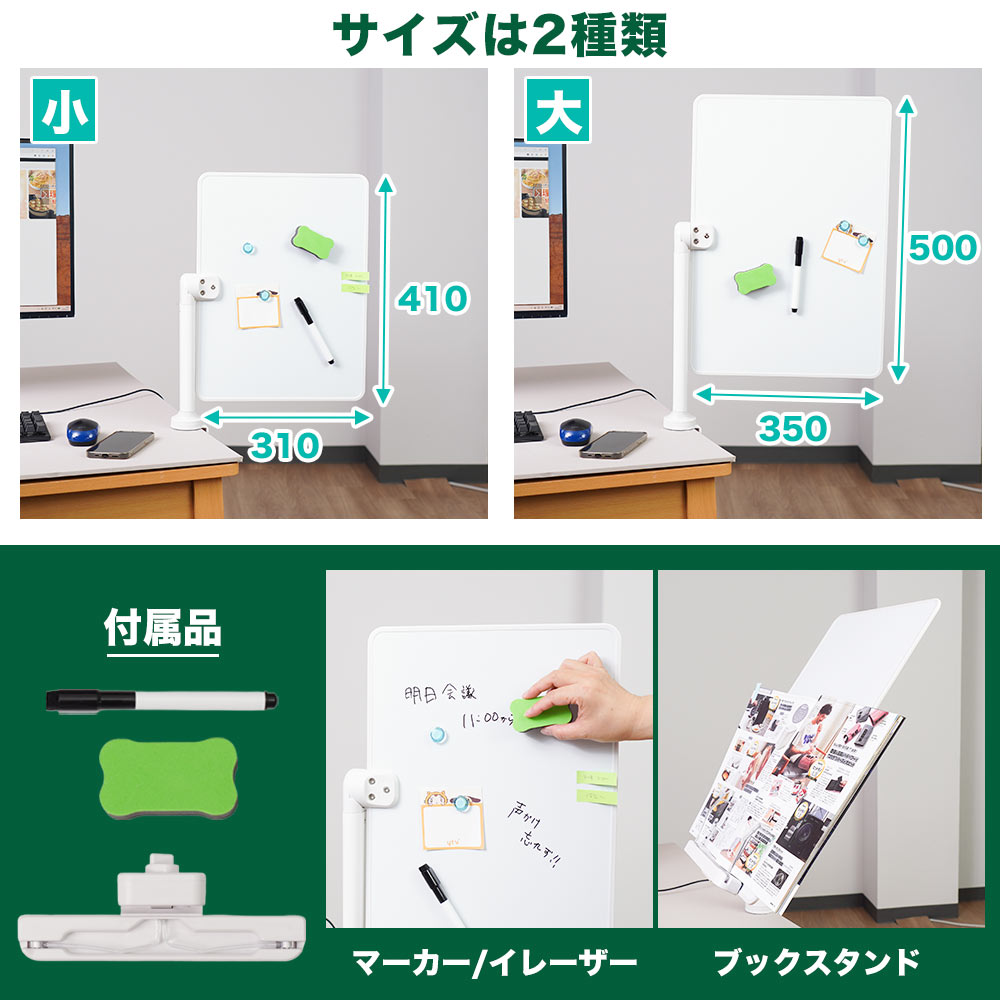 ホワイトボードのサイズ310×410mmと350×500mmの2種類をラインナップ。